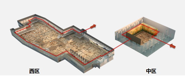 在中區(qū)遺址的設(shè)計(jì)動(dòng)線上,三塊巨型幕布將遺址北、東、西三面包圍住,打造成一個(gè)沉浸式CAVE影像播放空間。